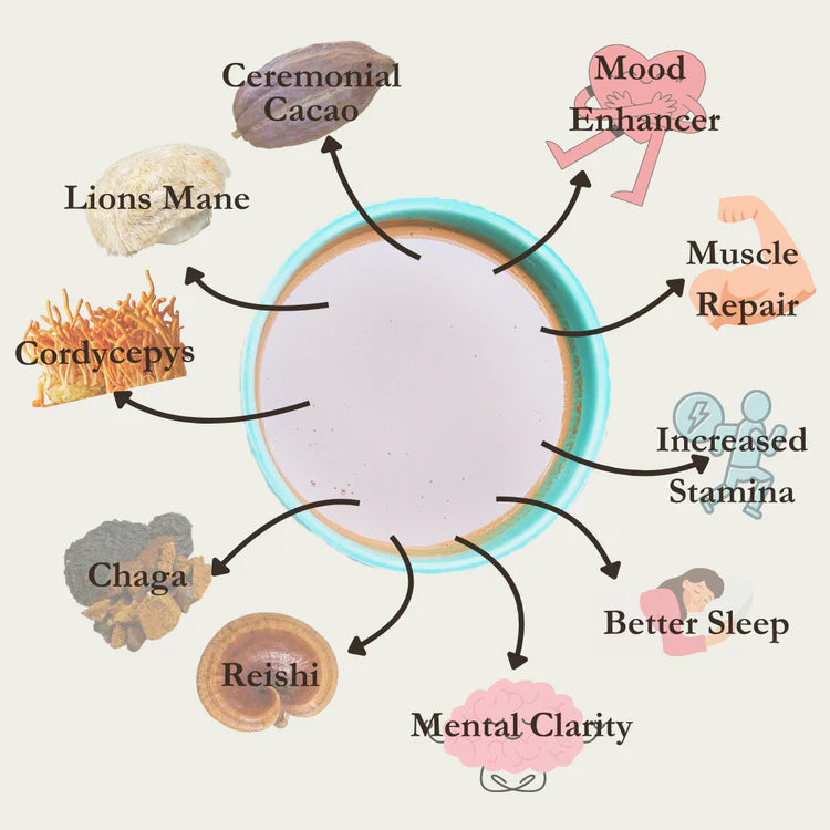 Focus FuelA powerhouse blend of ceremonial cacao and medicinal mushrooms—Lion’s Mane, Cordyceps, and Chaga—designed to enhance focus, mental clarity, and stamina. Ideal for busy professionals, students, and athletes seeking clean, sustained energy.