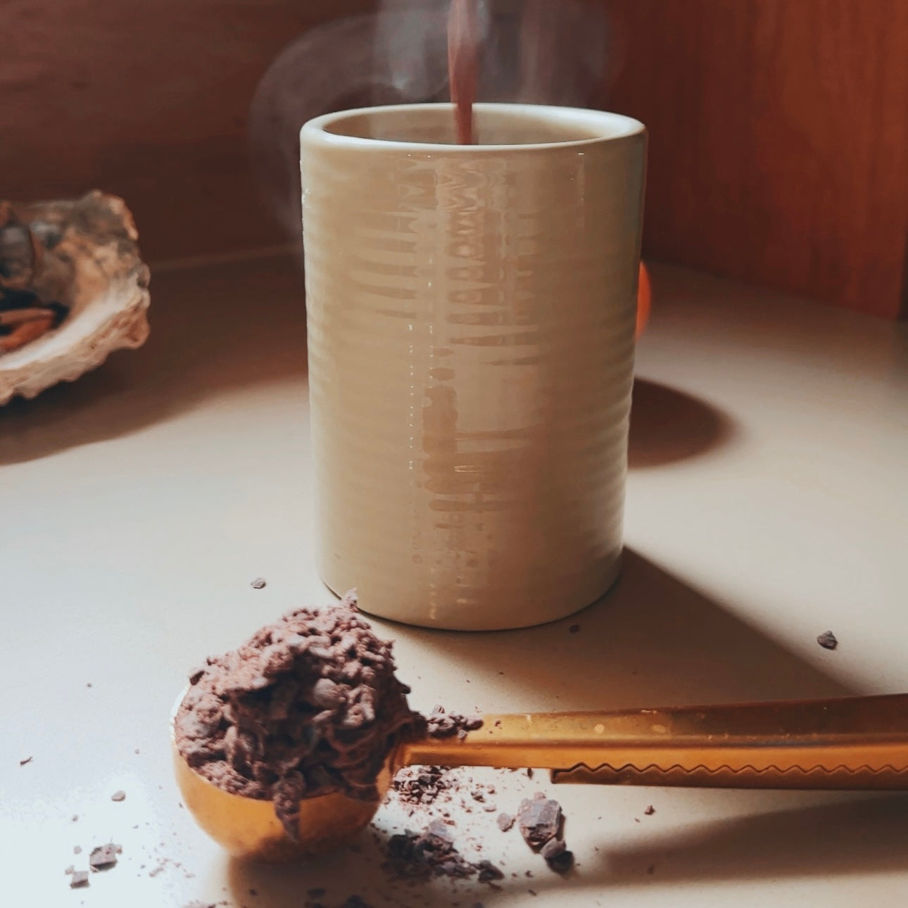 Cacao complements reishi by boosting serotonin levels, releasing feel-good endorphins, and fostering a sense of comfort and connection.